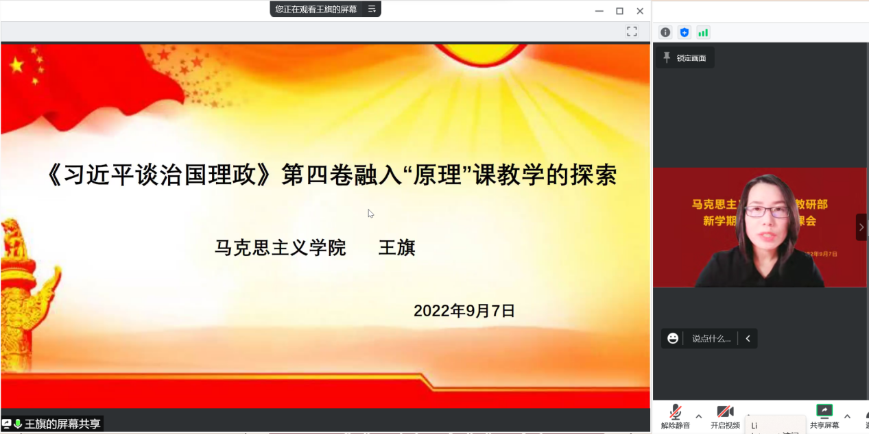 王旗老师以《习近平谈治国理政》第四卷中第三专题始终坚持人民至上与第十八专题弘扬全人类共同价值,推动构建人类命运共同体为中心,结合《马克思主义基本原理》第一章第二章的教学内容分享了她的教学体会,并且认为教师要做到真学、真懂、真信、真用,才能切实地将习近平新时代中国特色社会主义思想融入进《马克思主义基本原理》的课堂。