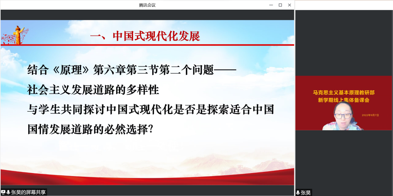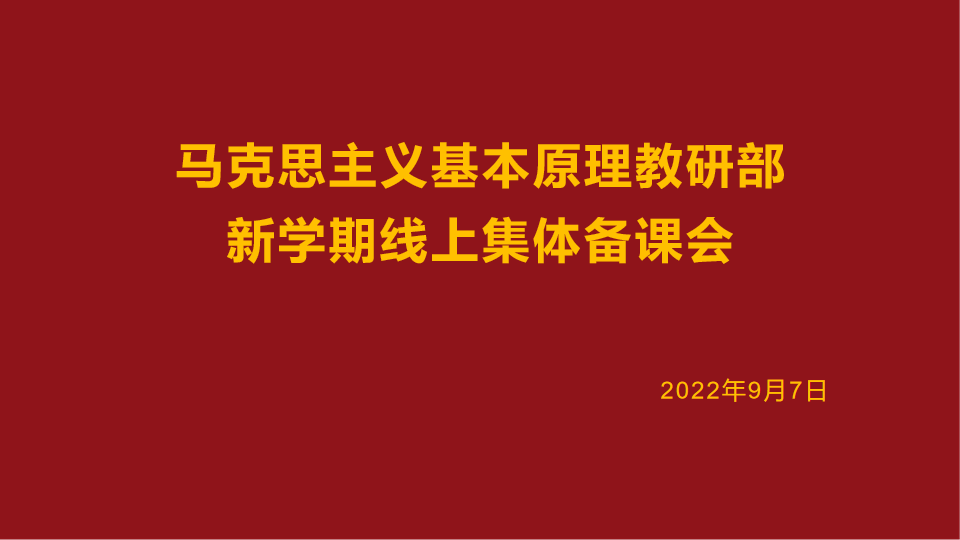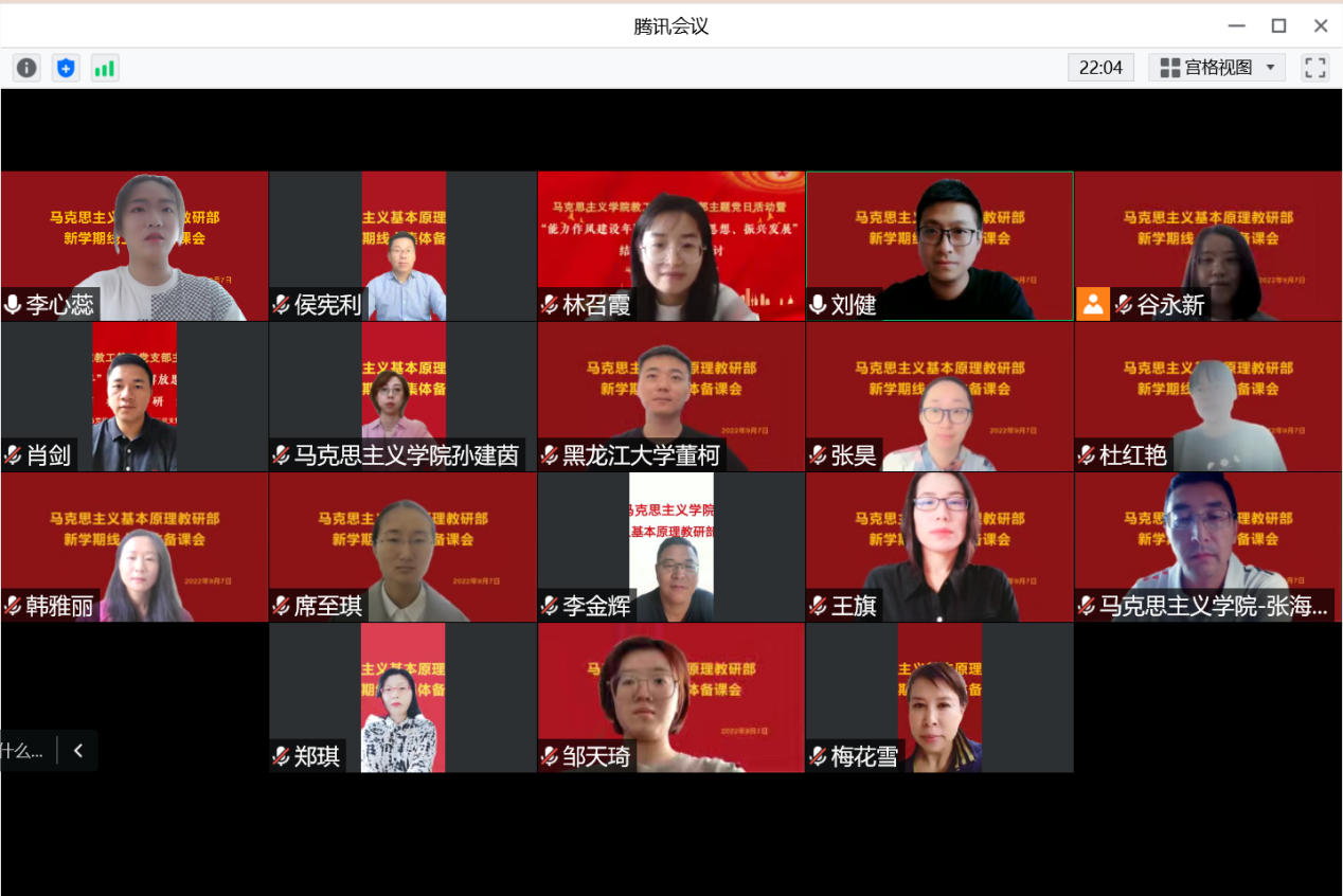 根据《XPJ官方网站“能力作风建设年”活动“解放思想、振兴发展”研讨专项工作方案》的工作要求,结合学校、学院学期初教学工作部署,切实提高《马克思主义基本原理》课程的教学质量,9月7日,XPJ官方网站马克思主义基本原理概论教研部召开2022年秋季学期线上集体备课会。本次备课以《习近平谈治国理政》第四卷融入马克思主义原理课程教学为主题,由教研部主任刘健主持,孙建茵教授与邹天琦、张昊、王旗、李心蕊四位青年教师做主要备课分享,教研部其他老师参加讨论并发言。