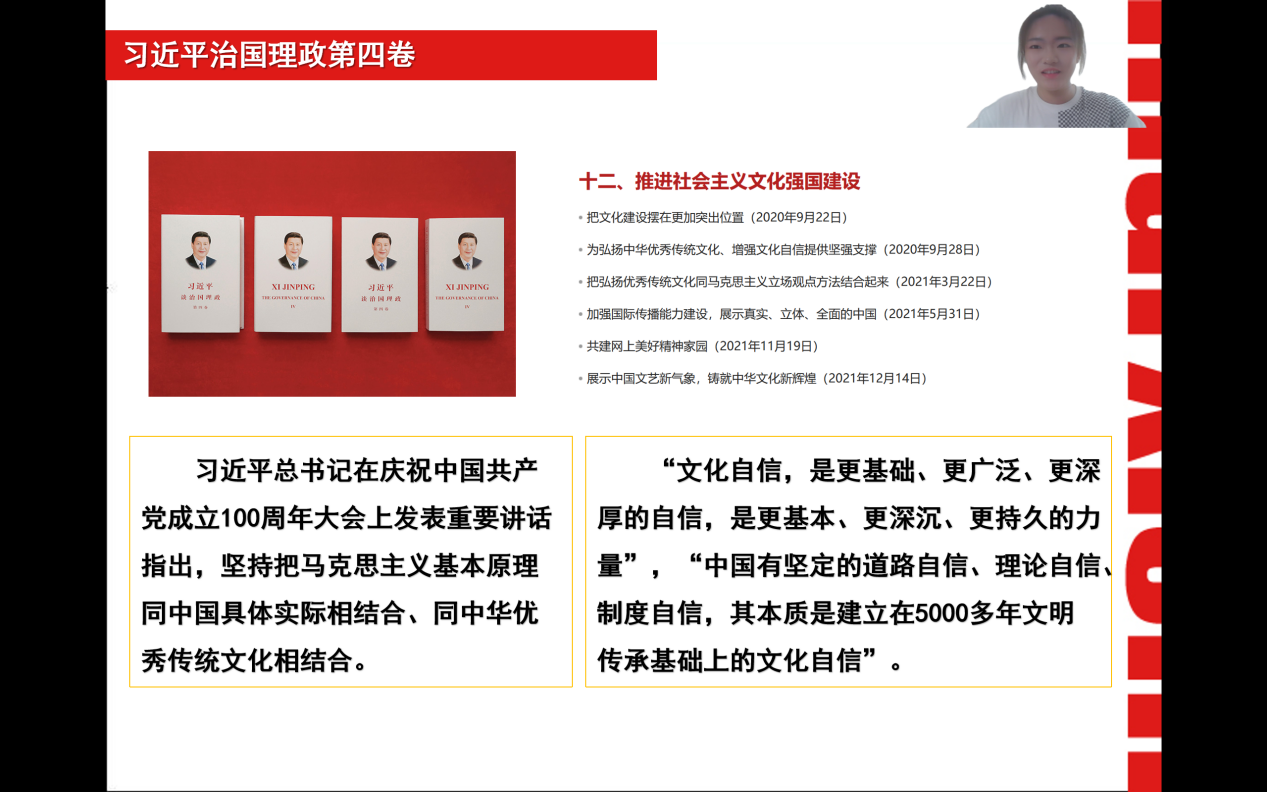 李心蕊老师结合自身学术背景,以《习近平谈治国理政》第四卷中有关文化自信内容为核心,分享了在《马克思主义基本原理》课堂教学中,将中国优秀传统文化与马克思主义基本原理相结合的一些案例。她认为,要在思政课堂上实现增强文化自信的目标,教师要始终坚持马克思主义指导地位,辩证看待中华传统文化。不断提升教师自身文化底蕴,优化完善课程教学设计。