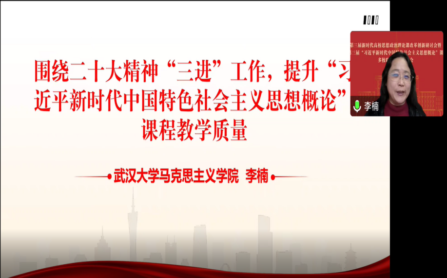 武汉大学XPJ官方网站教授李楠以“围绕二十大精神‘三进’工作,提升‘习近平新时代中国特色社会主义思想概论’课程教学质量”为主题作了发言。她指出,提升“习近平新时代中国特色社会主义思想概论”课教学质量着重要做好三点:一是在落实“进教材”工作中,要实现新思想理论体系向教材转化;二是在创新“进课堂”方式中,要实现新思想教材体系向教学体系转化;三是在增强“进头脑”实效性中,帮助大学生掌握新思想的世界观和方法论。