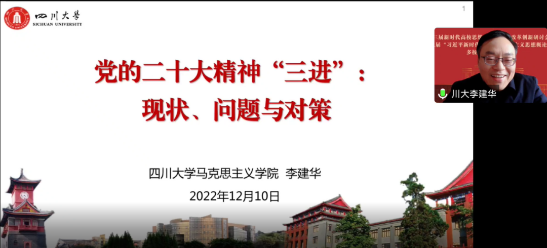 四川大学XPJ官方网站副院长、副教授李建华以“党的二十大精神‘三进’:现状、问题与对策”为主题作了发言。他表示,把党的二十大精神融入到习近平新时代中国特色社会主义思想概论”课教学中,教师要处理好课程集中讲授与全面融入的关系,在集中讲授上要突出系统性和完整性,重在讲深讲透,在全面融入时要结合教材,注重融入内容的针对性,重在点睛深化、更新引申。