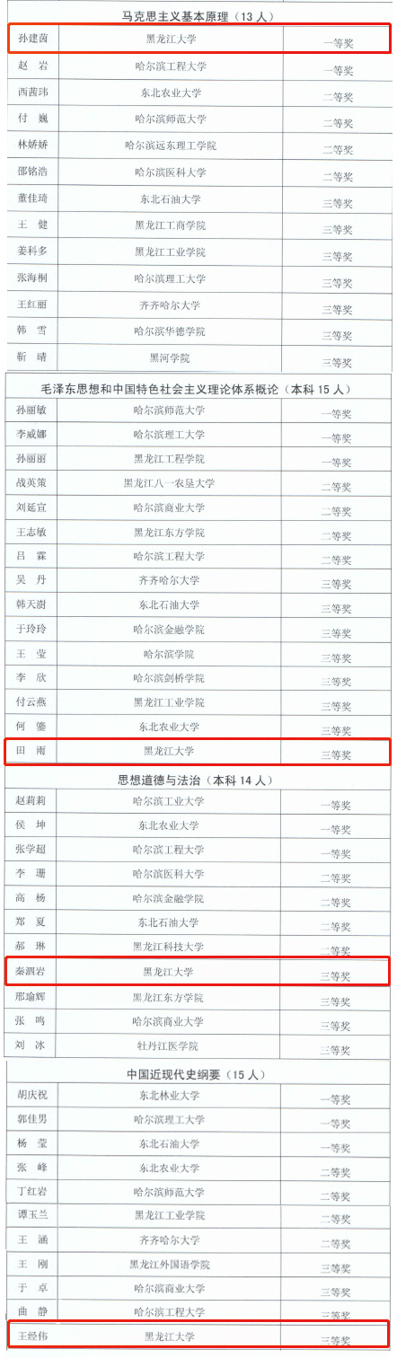近日,黑龙江省教育厅、黑龙江省教科文卫体工会委员会公布了《2022 年黑龙江省高校思想政治理论课教师教学大赛获奖名单》。我院共有4位教师喜获佳绩,其中马克思主义基本原理教研部孙建茵教授荣获一等奖,马克思主义中国化教研部田雨副教授、思想道德与法治教研部秦泗岩副教授、中国近现代史纲要教研部讲师王经伟分别荣获三等奖。本次大赛成果丰硕、精彩纷呈,充分展现了XPJ官方网站思政课教师的良好素养和教学风采,标志着XPJ官方网站在思政课教学质量提升、思政课教师队伍建设等重要领域取得了长足进步。