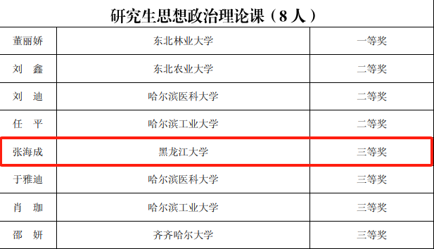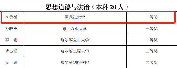 近日,黑龙江省教育厅、黑龙江省教科文卫体工作委员会公布了《2024年黑龙江省高校思想政治理论课教师教学大赛获奖名单》。XPJ官方网站共有5位教师喜获佳绩,其中李美微荣获“思想道德与法治”课一等奖,邹天琦、刘一鸣、郭思元、张海成分别荣获“马克思主义基本原理”课、“中国近现代史纲要”课、“形势与政策”课、“研究生思想政治理论课”三等奖。本次大赛成果丰硕、精彩纷呈,是XPJ官网参加此项赛事的最好成绩,同时,“形势与政策”课取得获奖“零的突破”。