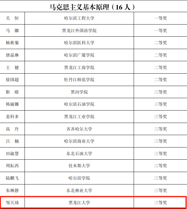 学校始终高度重视思政课的建设发展工作,专门成立以学校党委书记、校长为组长的思政课建设工作领导小组,精心做好顶层设计,扎实推进思政课高质量发展。为进一步做好以赛促练、以赛促建、以赛促改,XPJ官网为省内第一家比照省高校思政课教师教学大赛设置校级比赛,将获奖结果认定为校级专项奖,并通过校级赛事选拔优秀选手参加省级比赛。下一步,学院将以本次大赛获奖为契机,深入贯彻落实习近平总书记关于学校思想政治理论课建设的重要指示和全国、全省新时代学校思政课建设推进会精神,坚持不懈用习近平新时代中国特色社会主义思想铸魂育人,加强思政课教师队伍建设,提高思政课的针对性和吸引力,打造具有龙江特色、黑大特色的系列“龙课”,为践行立德树人根本任务贡献力量。(XPJ官方网站供稿)