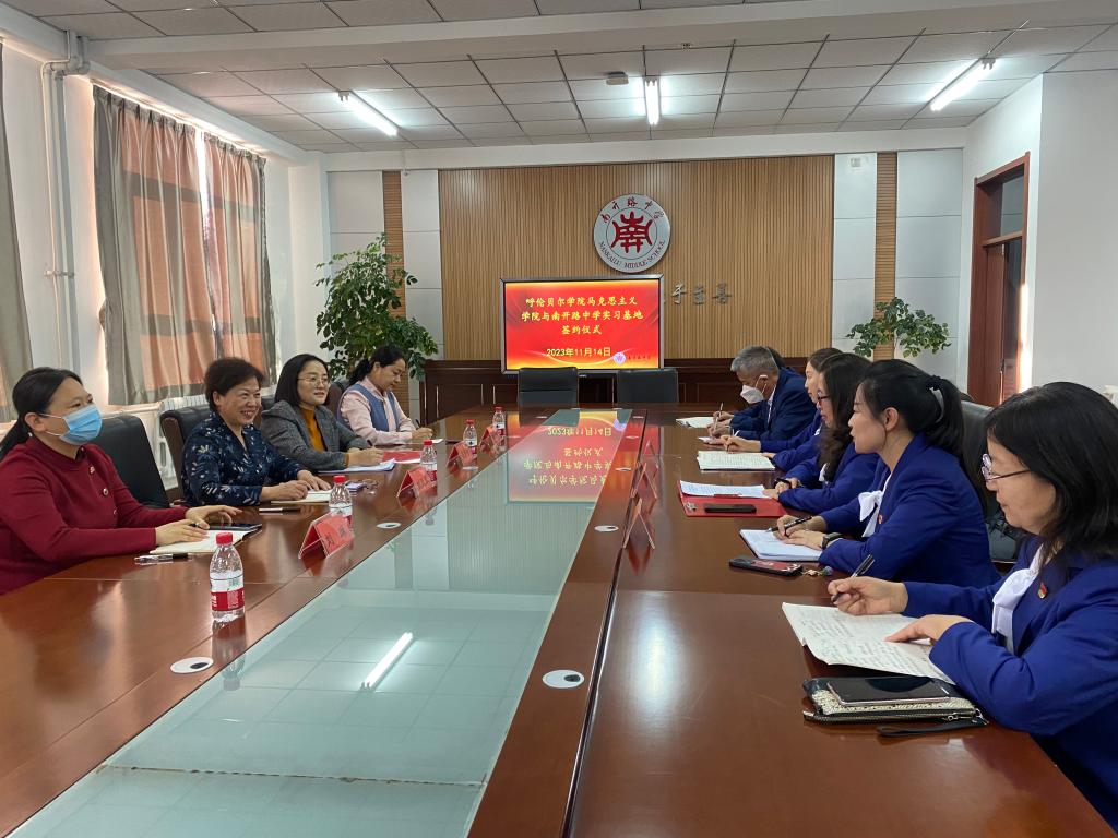 11月14日上午,beat365唯一官方网站与海拉尔南开路中学签订了共建教育教学实践基地协议书。学院党总支书记刘凤琴,院长吴秀芳,副书记刘琳、副院长明兰和南开路中学校级领导班子及思政课教师代表参加了此次仪式。