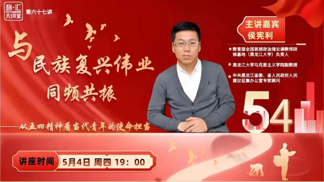 5月4日,在纪念五四运动104周年之际,XPJ官方网站XPJ官方网站侯宪利副教授应邀在“智·汇大讲堂”为青年学生做了题为“与民族复兴伟业同频共振——从五四精神看当代青年的使命担当”的专题讲座,号召广大青年从五四运动和五四精神中学习榜样精神,汲取榜样力量,成为与祖国前途同呼吸共命运的有理想、有担当的时代青年。