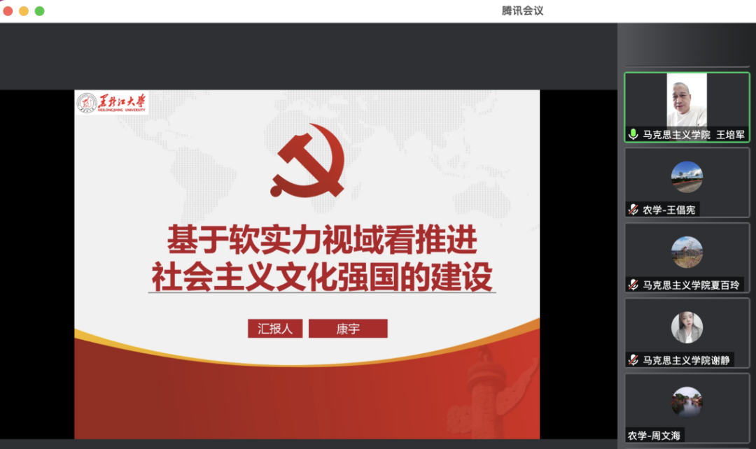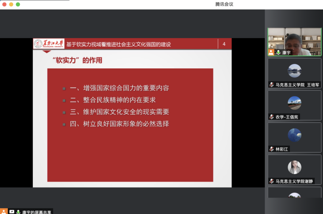 按照《中共XPJ官方网站委员会<习近平谈治国理政>第四卷的学习计划》要求,推动广大党员干部群众深入学习习近平新时代中国特色社会主义思想,迎接党的二十大胜利召开,9月20日下午,学校《习近平谈治国理政》第四卷基层巡讲专家讲师团成员、XPJ官方网站教授康宇为XPJ官方网站、新闻传播学院、现代农业与生态环境学院作题为《基于软实力视域看推进社会主义文化强国的建设》的宣讲。会议由XPJ官方网站党总支书记王培军主持,3个学院近200名师生通过腾讯会议参加学习。
