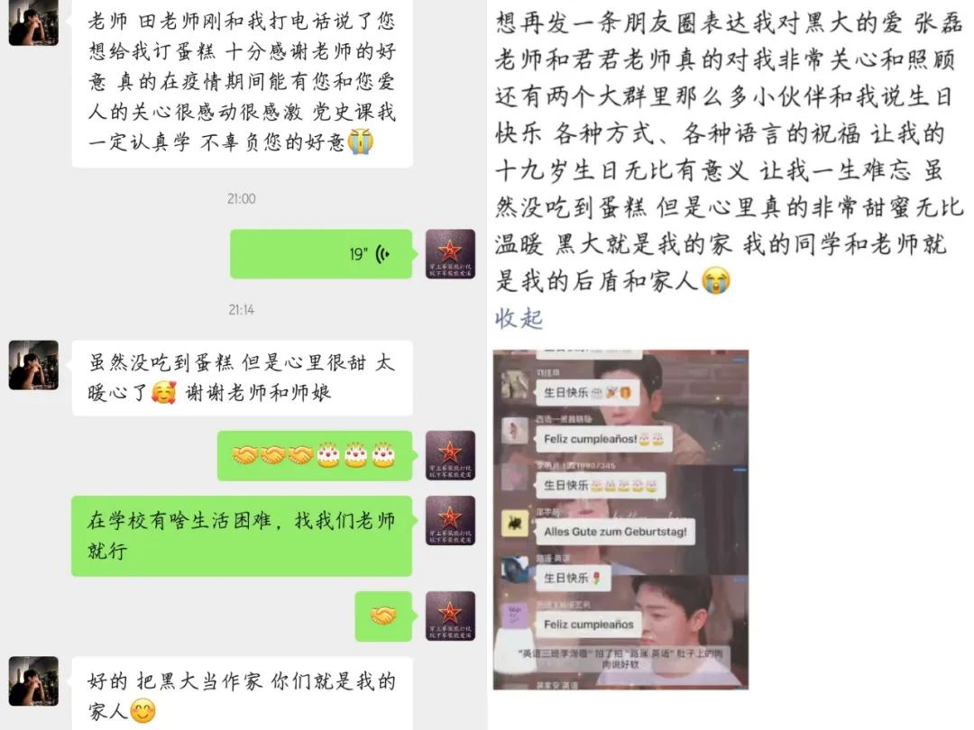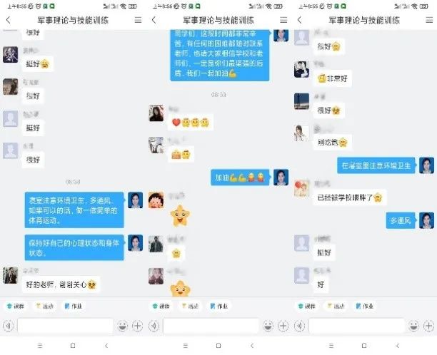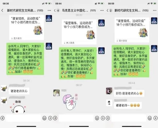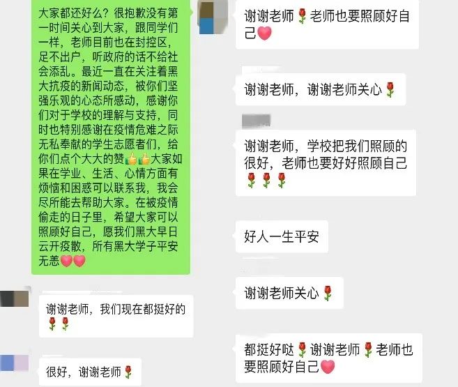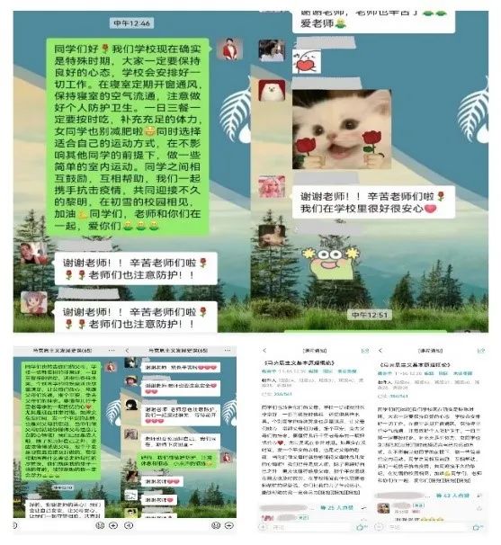 学院教工第二党支部书记、国防教育教研部的李国杨老师,马克思主义中国化教研部的陈阳老师和周宇宁老师在周末仍然不忘通过班级群与同学们保持联系,提醒各位同学们勤通风,多运动,保持良好的心情。思想政治教育教研部的张书洋老师在心理健康教育中心举办的“用心陪伴·用爱支持”系列网络支持性团体心理辅导活动中表示:“希望各位同学能正视自己的情绪,不让焦虑情绪主导我们的内心,放平心态正视当下,培养悦纳自我的态度。”马克思主义基本原理教研部的魏金华老师一边参与一线紧张忙碌的志愿工作,另一边还不忘通过学生群和自己的本科生、研究生保持联络。一线的核酸检测和物资配送工作是无比繁重的,但是她仍然在间歇的时候一个字一个字的敲下对学生们殷殷的嘱托。魏老师说:“学生和我儿子的年龄相仿,所以总是想从老师兼老母亲的角度再嘱咐嘱咐。”字字深情是儿行千里母担忧的共情;句句皆念是愿将丹心化红烛的坚守,魏老师以一位从教近30年的老教师的责任和担当,给家长带去安心,给同学们带去信心,给青年教师树立了榜样!中国近现代史纲要教研部的张磊老师承担着大一新生中共党史选修课的教学工作,看到XPJ官方网站官方微信公众号公布的过生日同学的名单后,张磊老师第一时间拿出自己的点名册,从上百位同学中一一核对,生怕错过自己任教班级中过生日的同学,虽然因为严格的疫情管控措施,这位2022级西语专业的同学没有能够收到张老师为他定制的生日蛋糕,但是可以相信在老师和同学的祝福声中,他一定度过了一个独一无二的生日。