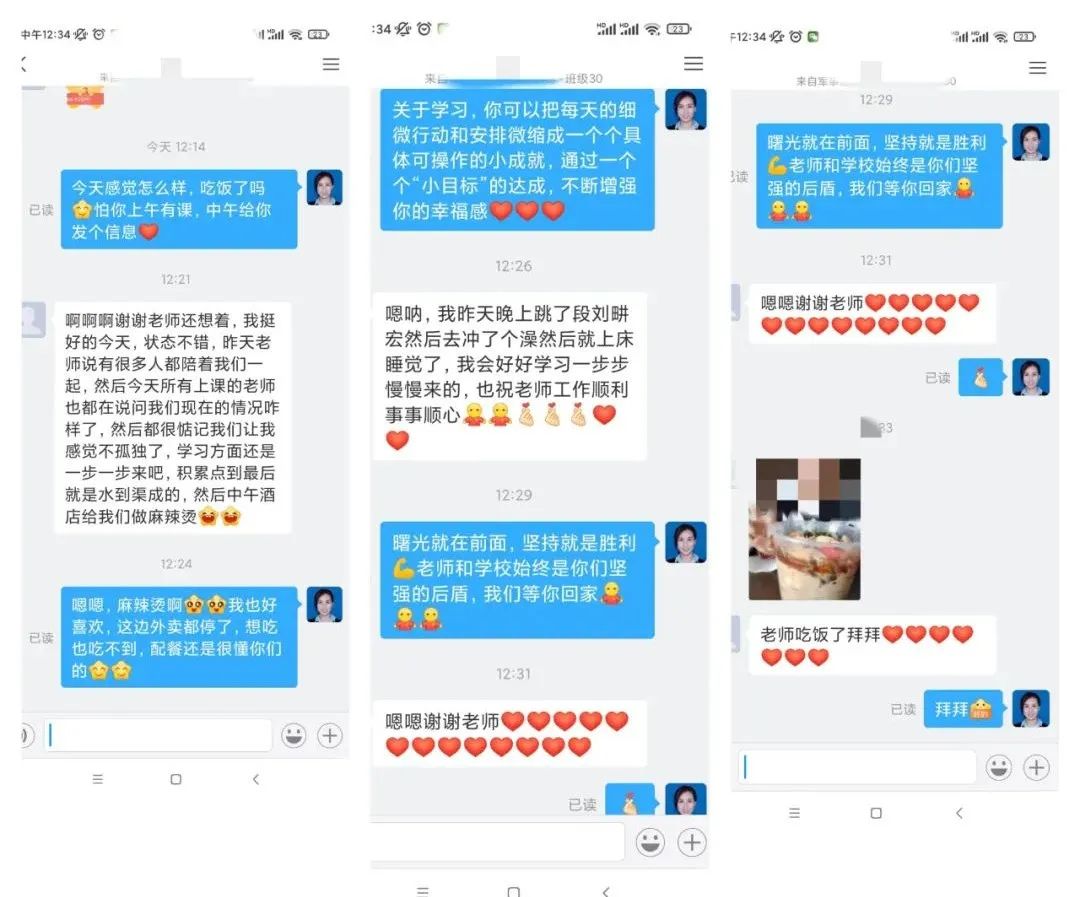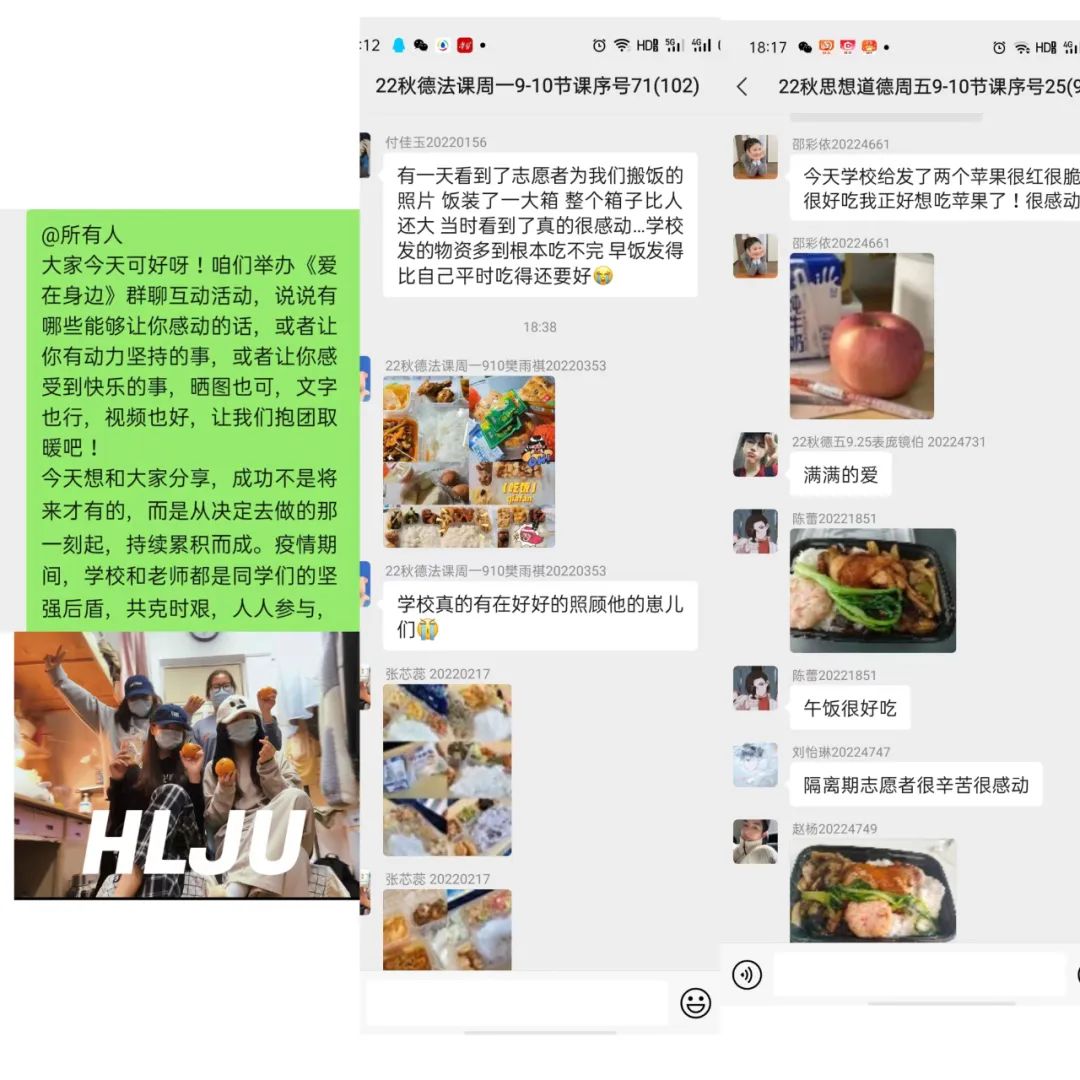处在教学一线的思政课教师们也从未间断对学生们的关爱。教工第二党支部书记李国杨老师在课上跟同学们表示任何问题都可以随时联系她。其中一个原住C16寝室楼、现在宾馆隔离的学生情绪不太稳定,李老师一直跟这个学生保持信息沟通,不断开导劝说给学生鼓励和关心。教工第三党支部书记谷真研老师每日在班级群里与学生们交流沟通,举办“爱在身边”群聊互动活动,让同学们分享感动的话、有动力坚持的事、感受到快乐幸福的瞬间等等。马克思主义基本原理教研部邹天琦老师在面对所任教班级同学的求助时,第一时间响应,在思想政治教育教研部的秦泗岩老师支持下,帮助这名同学解决了目前的问题,排解了焦虑情绪。思想政治教育教研部赵瑛琪老师在课堂上,以本次疫情防控身边的点滴为例,引导同学们感受困难面前人与人之间的温暖,正确认识社会主义核心价值观所倡导的“友善”。同时,她也向同学们分享了自己的隔离经历,鼓励同学们调整好心态,在房间内适当加强体育运动,保持身心愉悦。