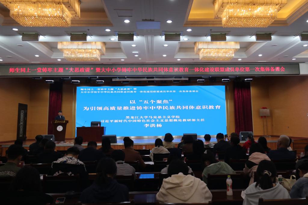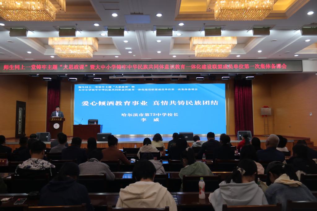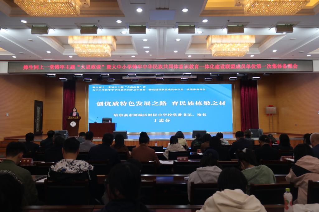 为贯彻落实习近平总书记关于加强和改进民族工作的重要思想,推动学校铸牢中华民族共同体意识教育高质量发展和推动大中小学思政课一体化建设,XPJ官方网站与哈尔滨市教育局共同发起成立由XPJ官方网站和哈尔滨市所辖9区27所中小学组成的大中小学铸牢中华民族共同体意识教育一体化建设联盟。5月11日上午,联盟成立大会在XPJ官方网站主楼一楼报告厅举行,校党委副书记李君明,省民族宗教事务委员会二级巡视员沃俊霞,中共哈尔滨市委教育工委专职副书记张国明,中央民族大学二级教授、博士生导师、国家级人才项目入选者、国家民委决策咨询委员会副秘书长严庆及省市区有关部门主要负责人、联盟成员单位主要负责人和XPJ官方网站相关单位负责人出席大会。成立大会由XPJ官方网站党总支书记张丹主持。