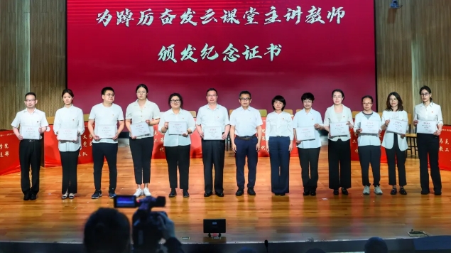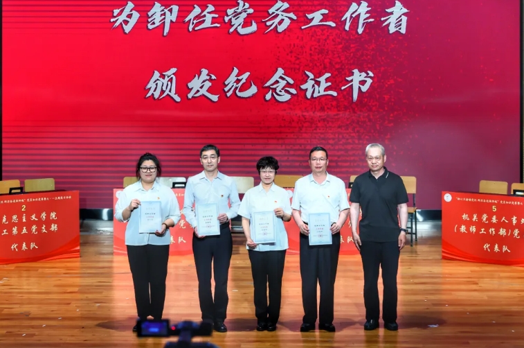 会上,为激励广大党员提高理论素养,举办党员知识竞赛活动。竞赛结束后,大会为卸任党务工作者颁发证书,为所有在六月份、七月份入党的党员共18人颁发政治生日贺卡,为光荣在党三十年的党员颁发纪念牌活动,引导党员时刻不忘自己的“第一身份”,并激励广大党务工作者深耕一线、带头做合格党员。随后,大会为踔厉奋发云课堂12名主讲教师颁发纪念证书,激励大家以多种形式传播党的创新理论。