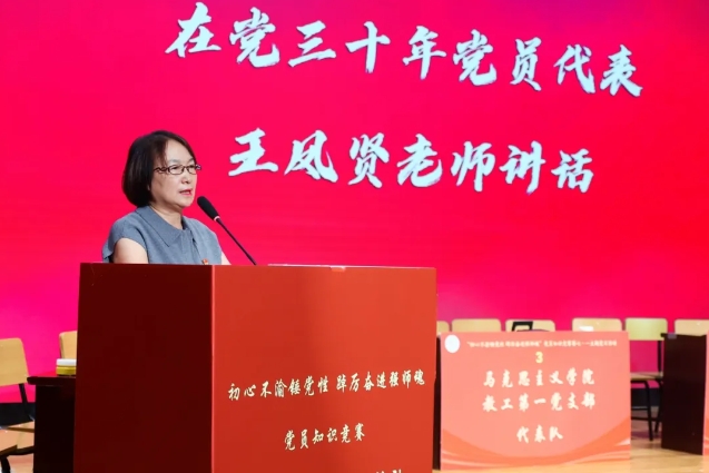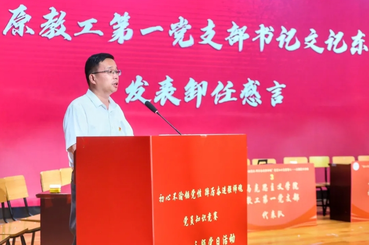 王凤贤代表在党三十年的党员发言。她回顾了三十年间在党的引领下个人和支部党员的成长、发展,三十年始终坚守初心和使命,展示了中国共产党员坚定信仰、甘于奉献的精神。原教工第一党支部书记文记东代表卸任的党务工作者做卸任感言。他回顾了支部工作取得的成效和成绩,代表卸任的党务工作者感谢学院党总支的信任和支持,并表示未来将继续认真履行党员义务、积极参与基层党建工作,做一名合格党员。