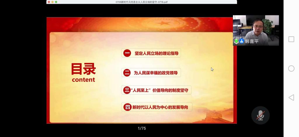 7月16日下午,beat365唯一官方网站“毛泽东思想和中国特色社会主义理论体系概论”课程组全体教师与内蒙古思政课教师通过腾讯会议共同聆听了吉林大学马克思主义理论一级学科带头人韩喜平教授做的题为《新时代马克思主义人民立场的坚守》的主题讲座。韩教授以马克思主义的基本立场为切入点,从坚定人民立场的理论指导、为人民谋幸福的政党领导、“人民至上”价值导向的制度坚守、新时代以人民为中心的发展导向四个方面深入分析了中国共产党人民至上的根本立场、制度保障以及在新时代的坚守等问题,诠释了中国共产党发展壮大的终极密码。