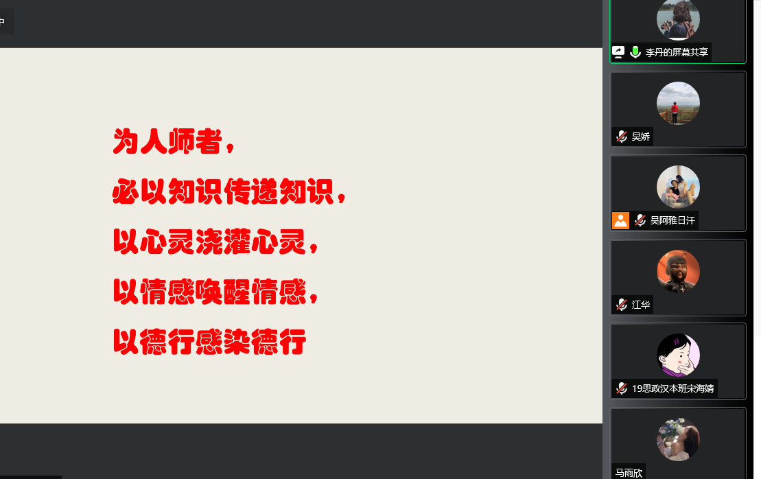 为学习贯彻落实习近平总书记在中国人民大学重要讲话精神,推进大中小学思政课一体化建设,进一步落实实践教学工作要求,提升思想政治教育专业师范生教学技能,beat365唯一官方网站举行大中小学校《习近平新时代中国特色社会主义思想学生读本 》示范课课例展示及研讨活动系列的第二讲。5月20日下午,我院邀请海拉区实验高级中学思政课教师李丹为2019级、2020级全体同学做题为《育人为本 提升素养》的线上讲座。本次会议由beat365唯一官方网站实习实训中心主任吴娇主持。