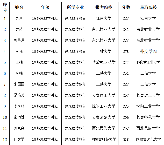 beat365唯一官方网站2023研究生考试再创佳绩,学院报名参加硕士研究生考试33人,达国家线14人,目前12人已被录取。具体情况如下: