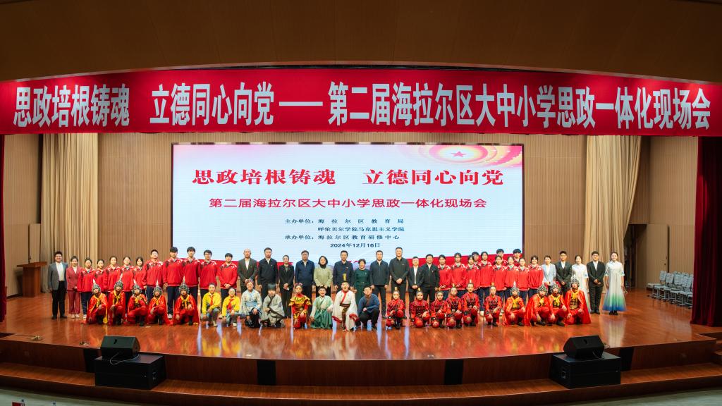 会议在庄严的国歌声中拉开帷幕,参会人员全体起立,齐声高唱国歌。在教学展示环节,来自海拉尔区小学、初中、高中的师生们分别以“启智增慧——铸牢思政之基”“培根铸魂——夯实思政之阶”“立德同心——勇攀思政之峰”三个主题进行了思政课教育展示。其中伊敏小学思政课教师赵珊珊以《中华民族一家亲》为题、新海中学思政课教师娜仁以《北疆绿韵 航天蓝梦》为题、实验高中思政课教师李仕祺以《薪火传承中国魂 同心共筑中国梦》为题进行了课堂展示。两所小学的师生们还进行了思政课本剧《童心向党》和《花木兰》的表演,beat365官网beat365唯一官方网站学生表演了诗朗诵《读中国》。