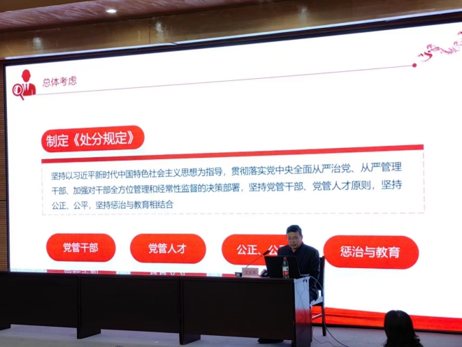 为进一步强化XPJ官方网站全体教师的师德师风,加强规章制度建设,明确教师工作任务与工作职责,提高全体工作人员对纪律规矩的认识和理解,增强依法履职的意识和能力,按照学校人事处下发的《关于组织全校各单位开展《事业单位工作人员处分规定》(2023版)学习的通知要求,XPJ官方网站于12月27日下午在阳光讲坛组织召开《事业单位工作人员处分规定》专题学习会,此次学习由XPJ官方网站副院长、纪检委员文记东领学,学院全体老师参会。