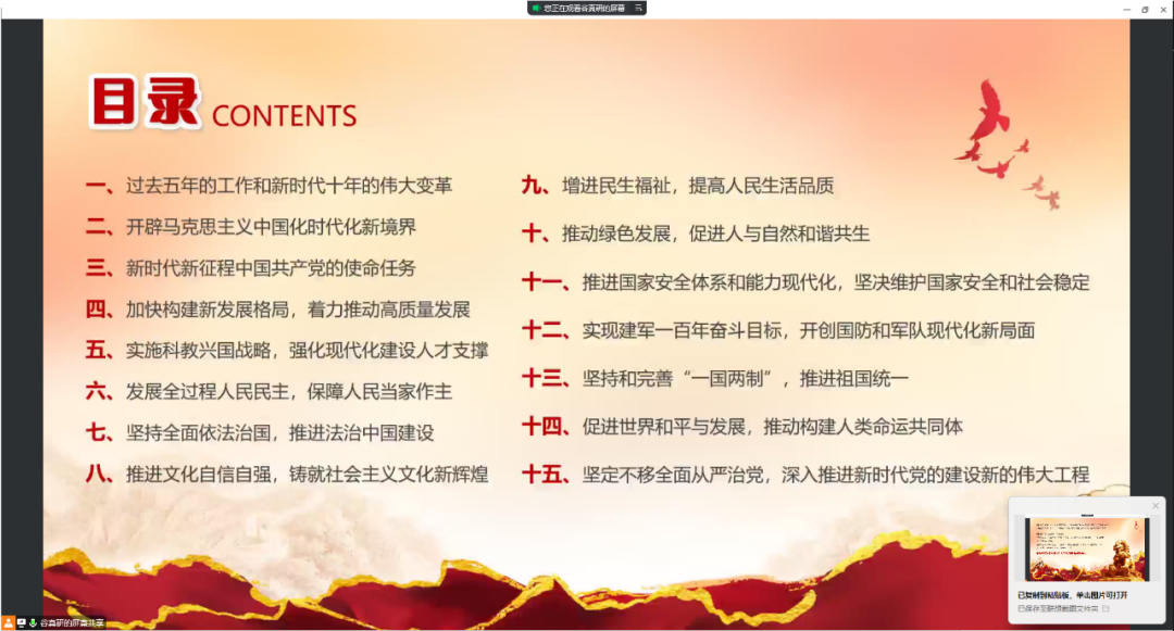 党支部书记谷真研紧紧围绕党的二十大报告原文,从报告的十五个方面对党的二十大精神进行了深度解读,强调报告举旗定向、主题鲜明、思想深邃、内涵丰富,总结了过去五年的工作和新时代十年的伟大变革,阐述了开辟马克思主义中国化时代化新境界、中国式现代化的中国特色和本质要求等重大问题,对全面建设社会主义现代化国家、全面推进中华民族伟大复兴进行了战略部署,是指引未来的纲领性文献。