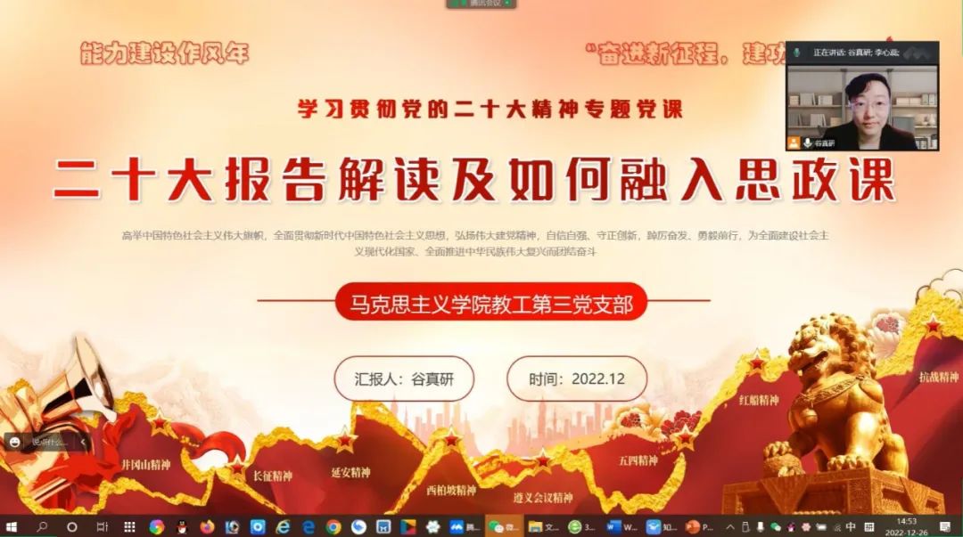 奋进新征程,建功新时代。根据学校党委工作要求以及学院党总支安排部署,12月26日下午,XPJ官方网站教工第三党支部组织开展了学习贯彻党的二十大精神专题党课活动,本次专题党课以“党的二十大报告解读及如何融入思政课”为主题,由党支部书记谷真研主讲,党支部全体党员参加并进行了热烈研讨。同时为了扎实推进“能力作风建设年”,推动落实中央《关于加强新时代廉洁文化建设的意见》、省委《关于加强新时代廉洁文化建设的工作措施》和学校党委、学院党总支的工作要求,党支部纪检委员董柯开展了以“学习中国共产党廉洁自律准则 永葆共产党员本色”为主题的专题党课。