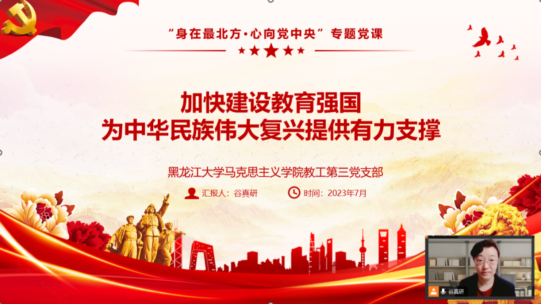 为扎实开展学习贯彻习近平新时代中国特色社会主义思想主题教育和深化能力作风建设“工作落实年”活动,深入贯彻落实党的二十大精神,根据学校党委工作要求以及学院党总支安排部署,XPJ官方网站教工第三党支部于7月7日,开展“身在最北方·心向党中央”专题党课活动,党支部书记谷真研为党支部全体成员讲授了题为“加快建设教育强国,为中华民族伟大复兴提供有力支撑”的专题党课。