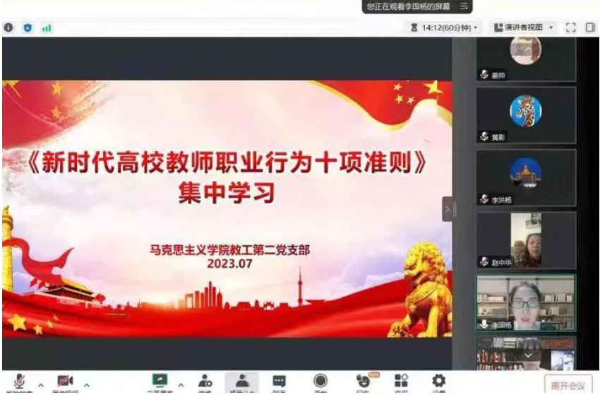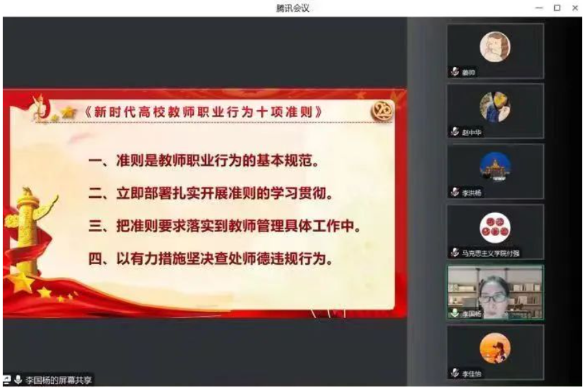 为贯彻落实习近平总书记关于教育的重要论述和指示批示精神,把握师德师风建设工作面临的新形势、新要求,全方位全过程强化师德养成,进一步增强立德树人、教书育人的责任感和使命感,按照学院党总支的工作部署,7月13日,XPJ官方网站教工第二党支部全体党员集体学习了教育部印发的《新时代高校教师职业行为十项准则》等文件精神,会议由党支部书记李国杨主持。