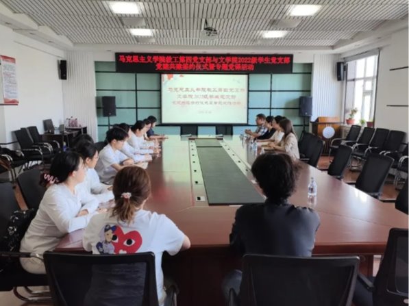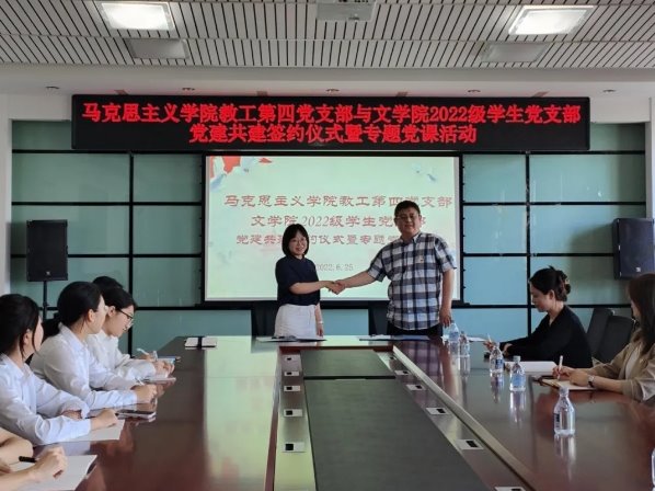 为创新基层党建工作载体,共同提升基层党建工作新格局,打造具有学院特色的党建品牌,6月25日下午,XPJ官方网站教工第四党支部与文学院2022级学生党支部在汇文楼750会议室举行党建共建签约仪式暨专题党课活动。XPJ官方网站教工第四党支部书记康宇及支委成员、文学院2022级学生党支部全体党员参加活动。会议由文学院2022级学生党支部书记关婧雯主持。
